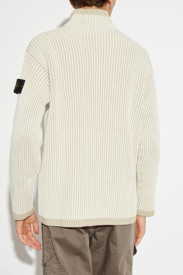 Presenting the Stone Island Ribbed Sweater – an exemplar of sartorial elegance and practicality. This luxurious piece, fashioned from the finest 100% wool, embodies the quintessential essence of refined casual wear. The sweater boasts a classic, straight cut with long sleeves and a simple hem, ensuring a timeless appeal. Its ribbed pattern adds a touch of sophistication and style, making it a versatile addition to any wardrobe. The cream-beige hue enhances its universal charm, suitable for various occasions. Notable for its functional zipper at the collar, this sweater allows for adjustable comfort and a customizable look. The left sleeve proudly features the iconic Stone Island compass logo patch, a hallmark of the brand\'s distinguished aesthetic. As a testament to Stone Island\'s heritage of relentless textile innovation, this sweater integrates seamlessly into both casual and refined ensembles, as evidenced by its pairing with beige cargo pants and a jacket in the accompanying visuals. Why You Should Buy This Product Crafted from premium 100% wool for exceptional warmth and comfort. Classic design with a modern ribbed texture, ensuring timeless style. Adjustable zipper collar for versatile wear. Iconic Stone Island logo patch, symbolizing luxury and exclusivity. Elegant cream-beige color, perfect for a variety of outfits.