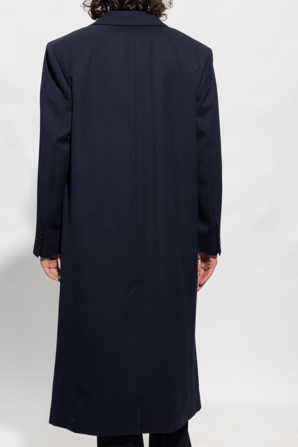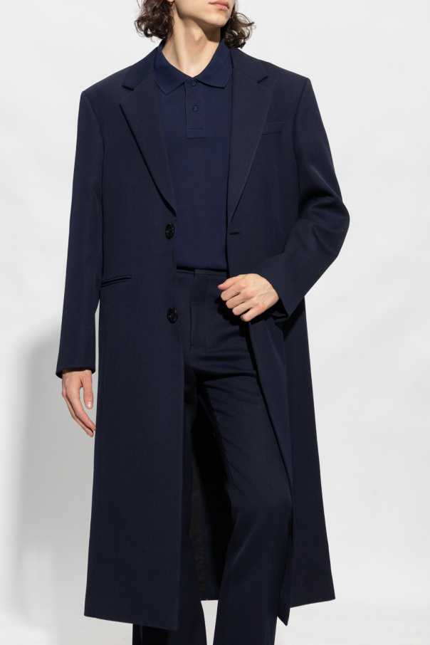 Navy ribbed coat from Ami Alexandre Mattiussi. Made of wool, this pair is complete with button fastenings, notch lapels, three front pockets, long sleeves and single rear vent.
