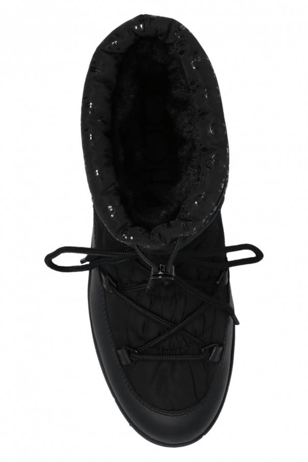 Black ‘Wanaka’ snow boots from Jimmy Choo. Embellished with a monogram motif, this lace-up model features leather trims and a black rubber sole.