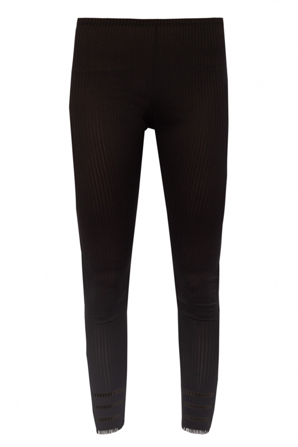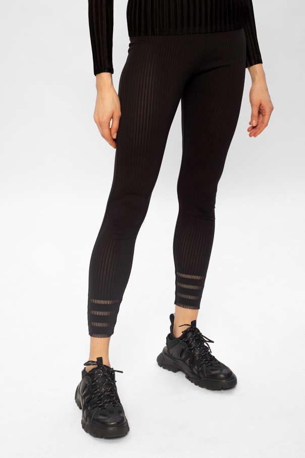Black leggings from Issey Miyake Pleats Please. Crafted from ribbed fabric, this style has an elasticated waistband and decorative cut-out details.