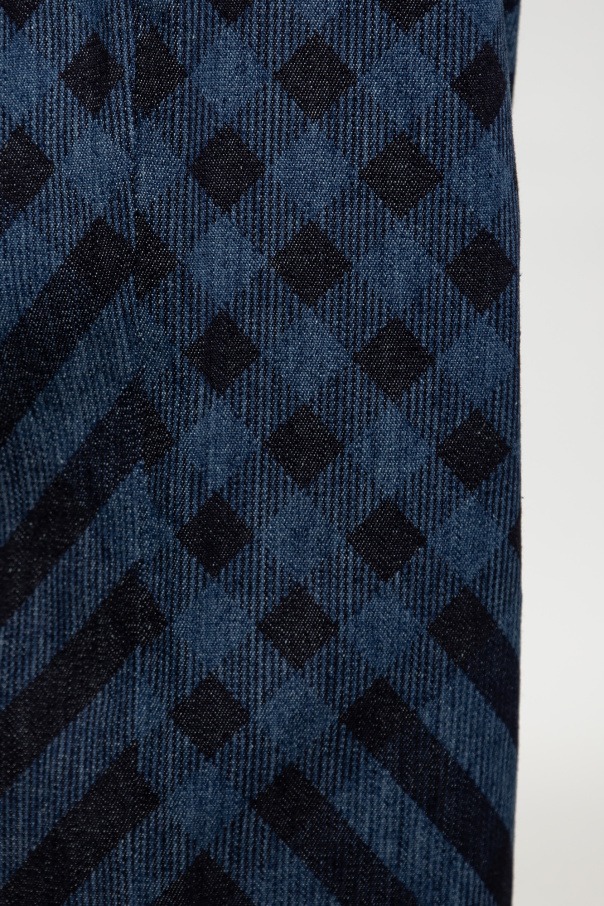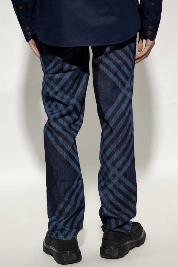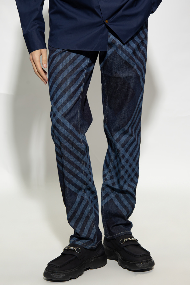 Blue and navy blue ‘Cruise’ jeans from Vivienne Westwood. Embellished with a check pattern, this pair falls with slightly tapered legs and features button fastenings, two slip pockets, one snap-fastened pocket and a logo patch on the back.