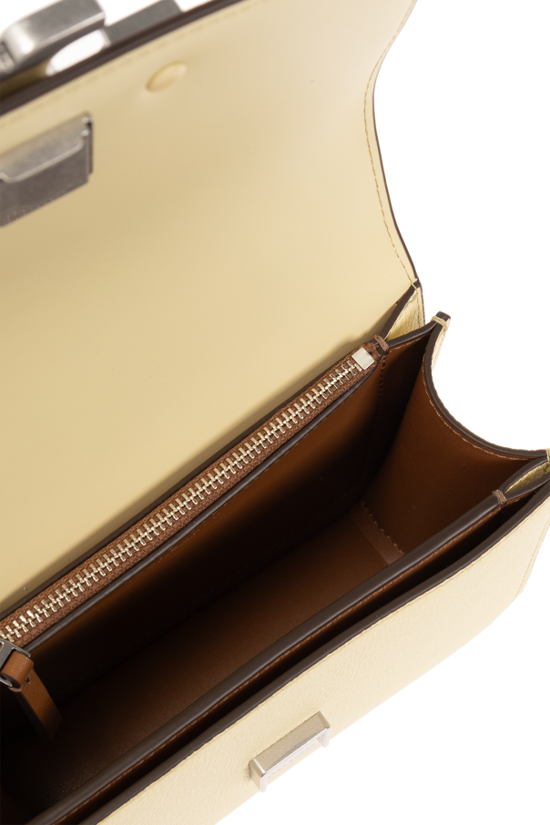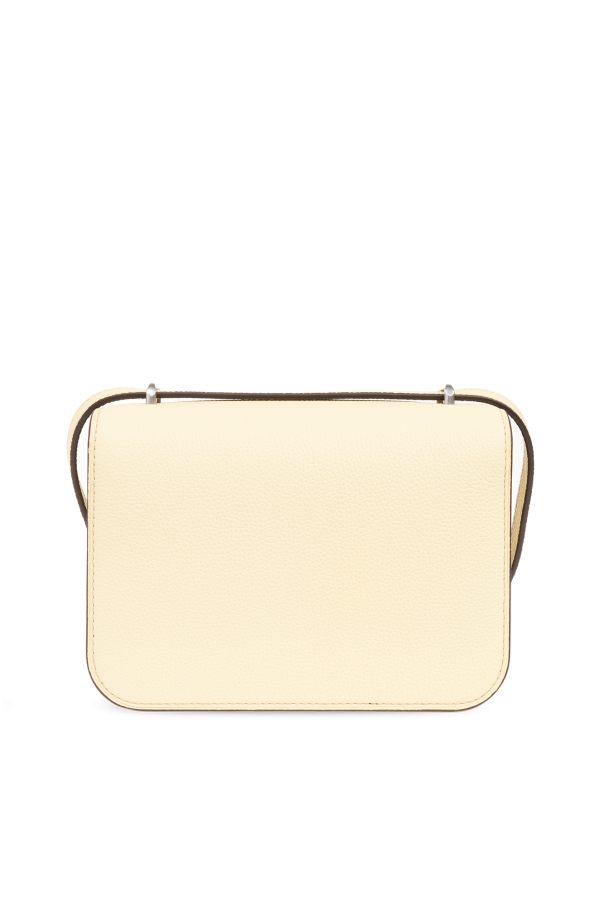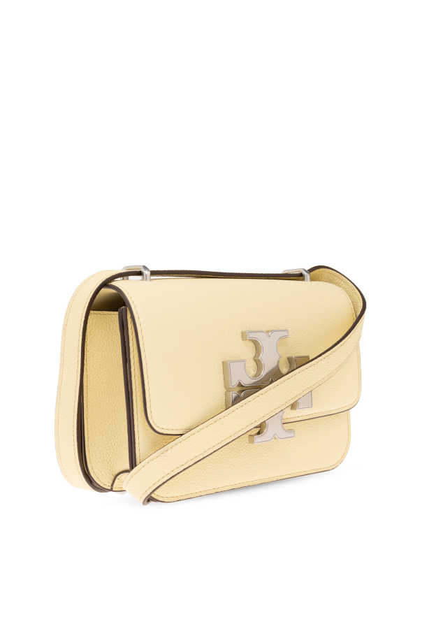 Introducing the \'Eleanor Small\' shoulder bag by Tory Burch, a testament to understated elegance and sophisticated design. Crafted from 100% high-quality leather with a subtle grain, this bag features a pastel yellow or creamy hue that exudes a serene and refined vibe. The rectangular shape with rounded corners encapsulates a minimalist aesthetic, making it a timeless addition to any wardrobe. The bag\'s front is adorned with a large metallic \'T\' logo, finished in a likely silver tone, serving not only as a distinctive mark of luxury but also as the bag\'s closure mechanism. Its adjustable strap offers versatile wearability, enabling it to be worn over the shoulder or across the body for hands-free elegance. The interior, presented in a darker shade of brown or beige, offers a main compartment and an additional zip pocket, lined with 100% polyurethane for durability and ease of maintenance. Metal details, including fastenings and potential feet, are color-coordinated with the logo, adding a cohesive finish to this exquisite piece. Why Purchase This Product? Elegant Design: Its minimalist aesthetic and subtle color palette render it a versatile accessory for any occasion. Premium Materials: Crafted from 100% leather, with a durable polyurethane-lined interior and metal accents. Versatility: The adjustable strap allows for shoulder or crossbody wear, adapting to your style and comfort needs. Signature Detailing: The metallic \'T\' logo not only signifies the Tory Burch brand but also adds a touch of luxury.