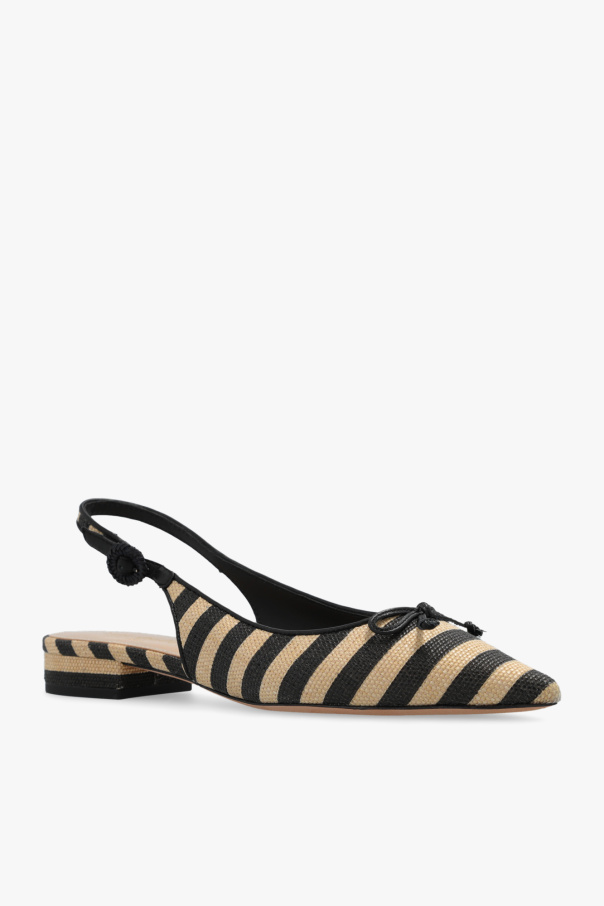 Beige and black ‘Veronica’ shoes from Kate Spade. Crafted from raffia and trimmed with leather, this model sits on a beige leather sole and showcases a stripe pattern, a black bow, a pointed toe and an adjustable buckle strap at the back.