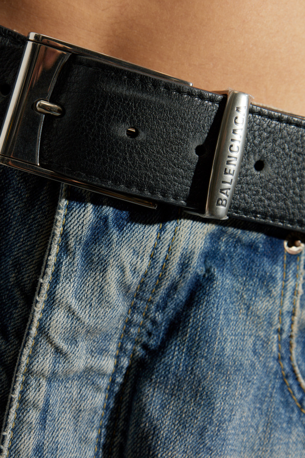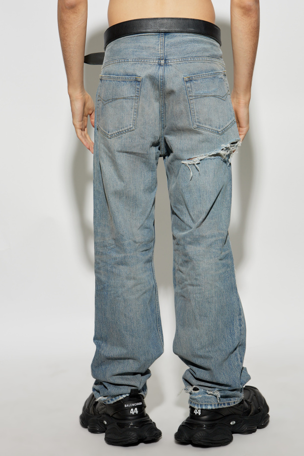 Introducing the Vintage Effect Jeans by the illustrious Balenciaga, a testament to timeless elegance and modern flair. Crafted from the finest 100% cotton denim, these jeans embody a sophisticated blend of classic and contemporary styles. The regular fit grants a relaxed silhouette, while the vintage-inspired design features distinctive distressed accents and artful abrasions on the knees, enhancing their rugged yet refined charm. A subtle blue wash complements the retro aesthetic, embodying authenticity and effortless chic. Accentuated with a sleek black leather belt showcasing the iconic brand logo on a metallic buckle, these jeans are the epitome of versatility, seamlessly transitioning from casual to chic ensembles. The traditional back pockets and button fastening ensure functionality without compromising style. Why Choose This Product? Exclusive design from renowned designer Balenciaga Premium 100% cotton denim for superior comfort Authentic vintage look with contemporary details Versatile styling options for various occasions