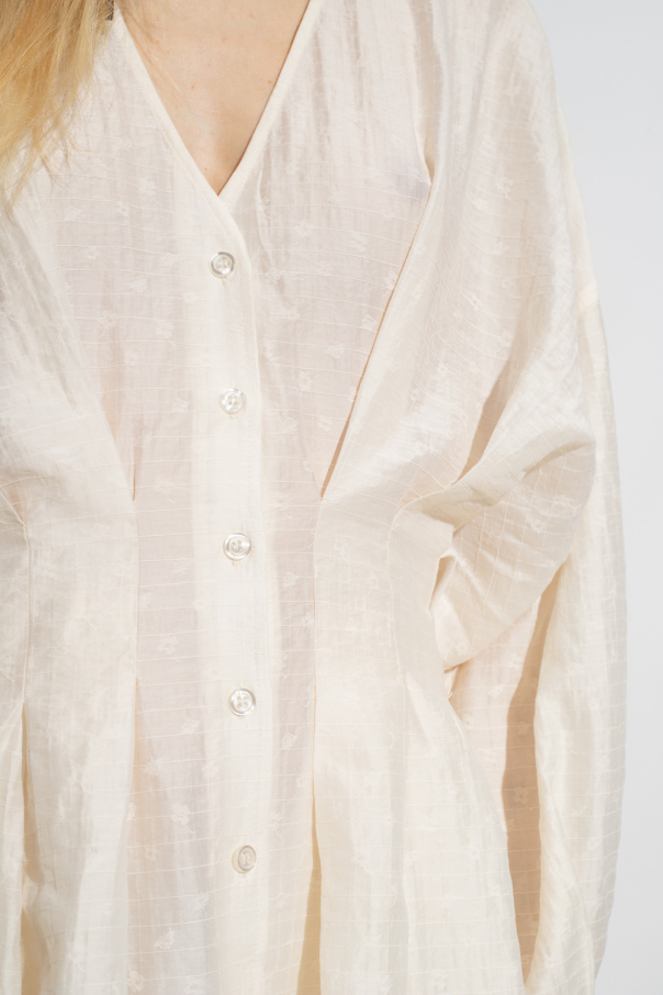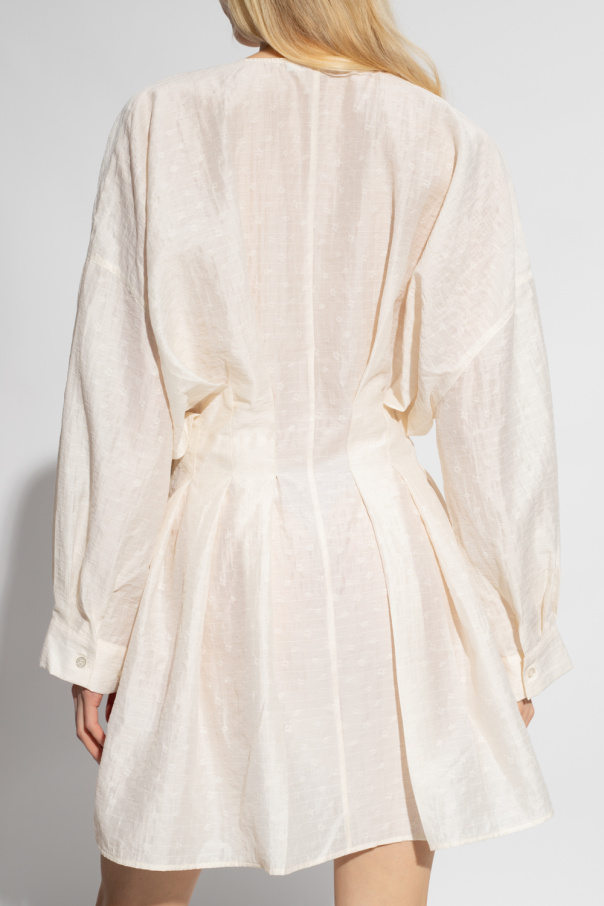 Cream ‘Engla’ mini dress from Samsoe Samsoe. Crafted in part from TENCEL™ lyocell, this style is fitted at the waist and showcases a jacquard pattern, front button fastenings, a V-neckline, two slip pockets and long sleeves with button cuffs.
