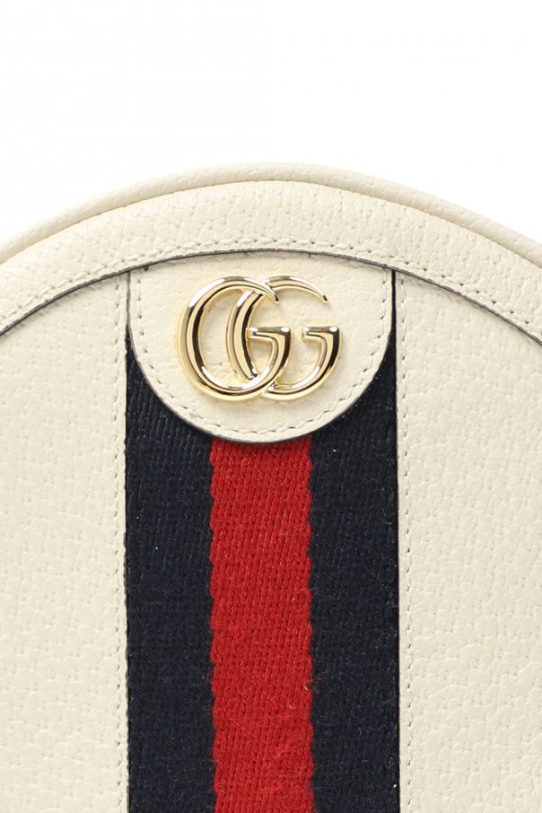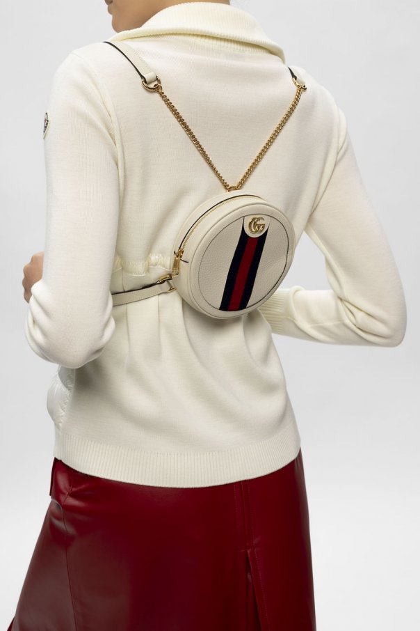 Creame ‘Ophidia’ round backpack from Gucci. Size mini. Made of leather. Zip fastening. Decorated with a navy and red ‘Web’ stripe and a logo applique in antique gold-tone. Adjustable leather shoulder straps with chain elements. Main internal compartment with two card slots. Antique gold-tone metal hardware.