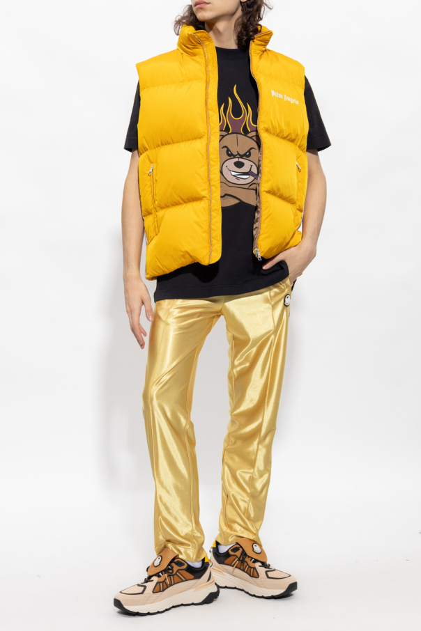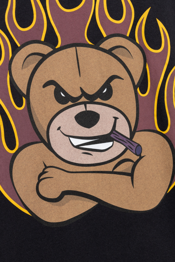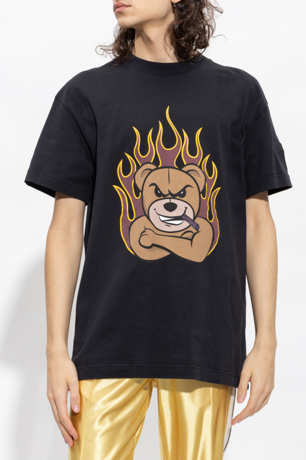 Black T-shirt from Moncler Genius, the ‘8 Moncler Palm Angels’ collection. Crafted from cotton, this pair features a multicolored print with the brand\'s signature teddy bear and flame motif, white logo print at the back and ribbed crew neck.