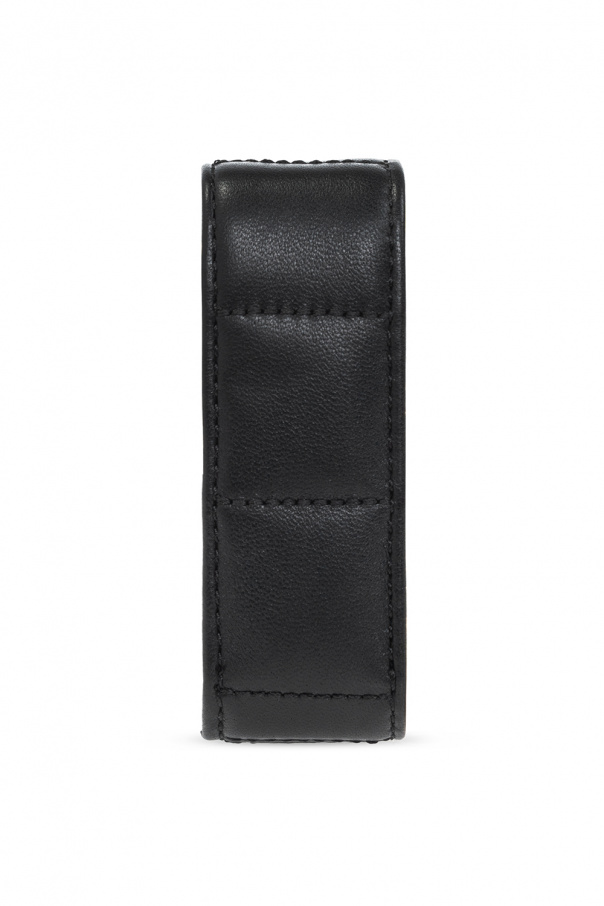 Black lipstick case from Michael Michael Kors. Made of quilted leather, this item features a snap fastening and gold-tone metal hardware, including a logo plaque and a chain strap.