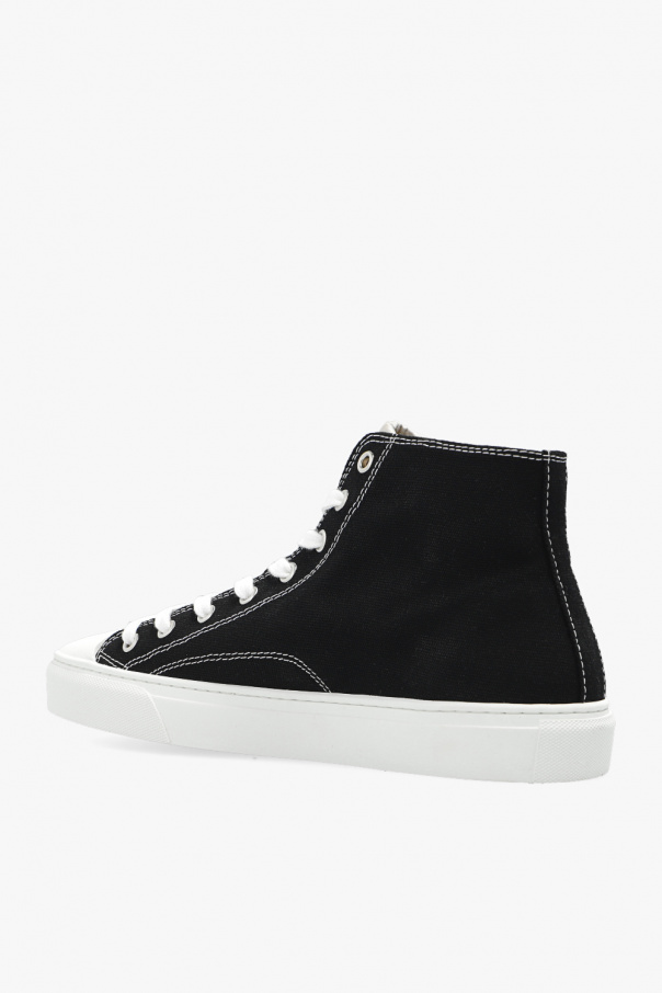 Black high-top sneakers from Vivienne Westwood. Made of canvas, this lace-up pair features a tongue patch with a logo, the label’ signature orb and rubber sole in white.