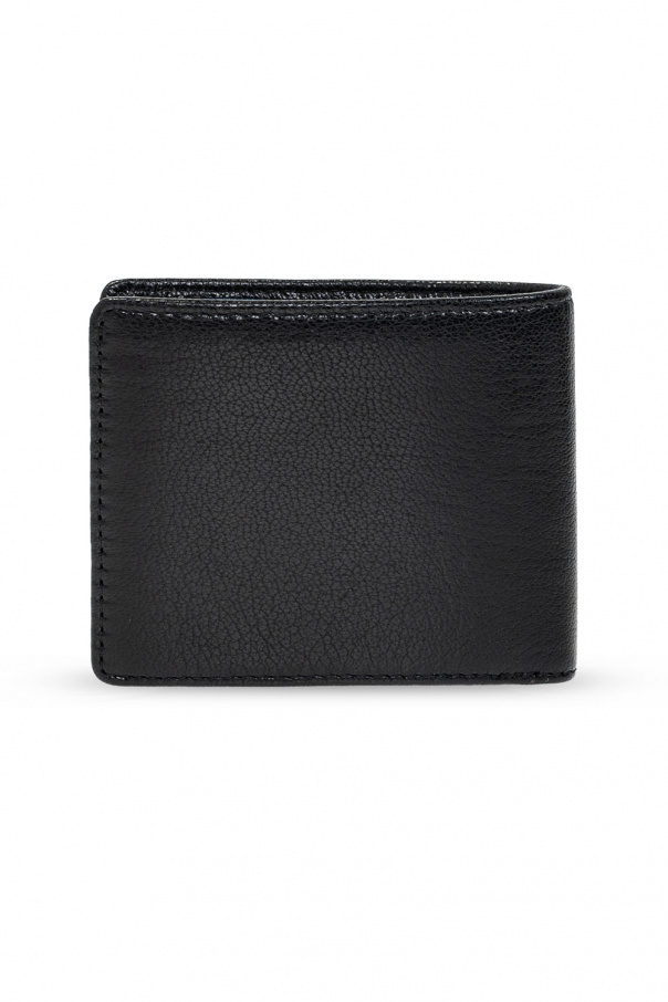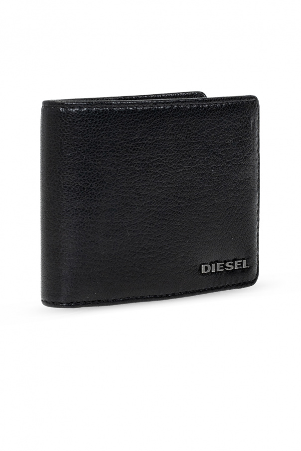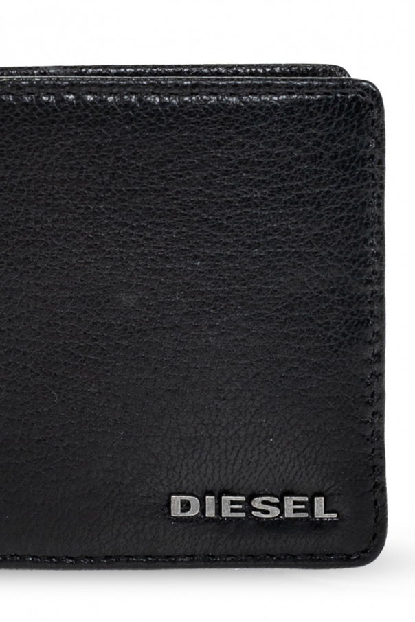 Black bifold wallet from Diesel. Made of leather, this item features a metal logo in antiqued silver-tone and has blue denim lining, one bill compartment and eight card slots inside.