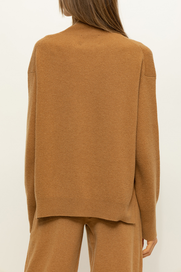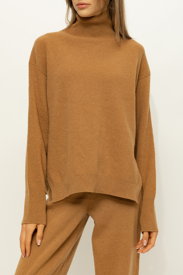 Brown ‘Arya’ turtleneck sweater from Nanushka. Crafted from a merino wool and cashmere blend with a ribbed knit, this style features a snug collar, side slits and long sleeves.