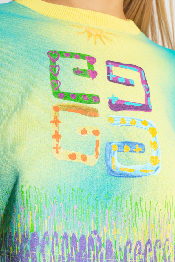 Yellow and green cropped sweatshirt from Givenchy x Josh Smith. Made of cotton, this garment features a spray paint effect, multicolored prints, 4G logo, ribbed trims at the crew neck and cuffs as well as a raw-trimmed hem. This model was created in collaboration with the creative director of Givenchy, Matthew M Williams and the American artist Josh Smith, whose colourful psychedelic graphics enliven the brand's iconic designs.