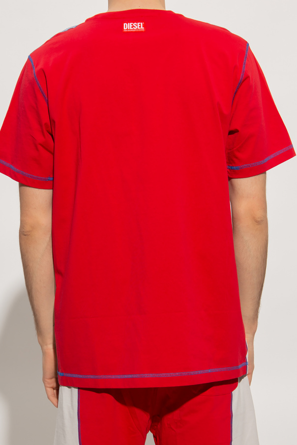 Red and white ‘Umset-Just-Tomy’ pyjama set from Diesel. Made of cotton with blue stitching details, this set includes a crewneck T-shirt with shorts sleeves, logo patch at the back as well as shorts with an elastic waistband embroidered with a logo and back pocket. Comes with a bag with drawstrings and a logo detail.