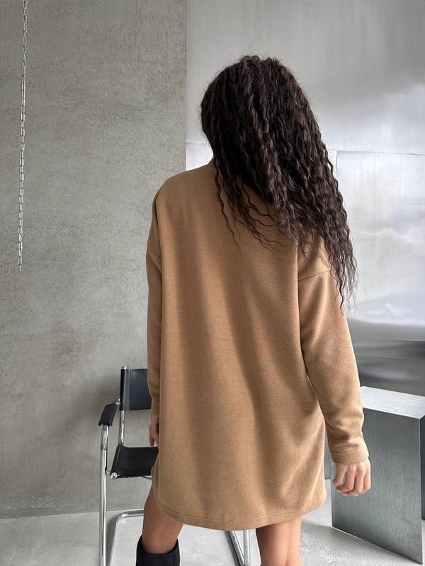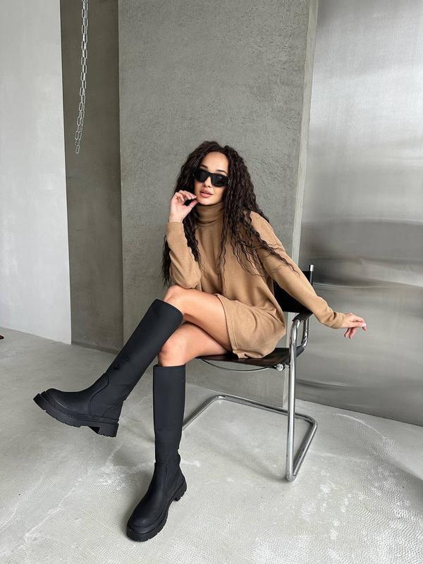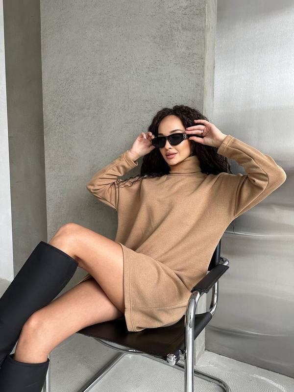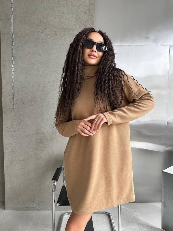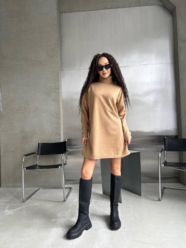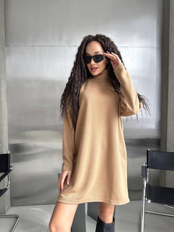 Колір сукні - ніжний бежевий, що робить її ідеальним варіантом для повсякденних або офіційних образів. Тканина виготовлена з двосторонньої ангори - це мʼякий, приємний на дотик матеріал, що добре зберігає тепло і водночас має