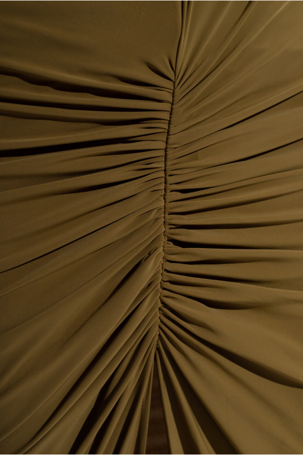 Dark green gathered beach skirt from Balmain. Made of stretch fabric, this asymmetric garment features an elastic waistband and side slit.