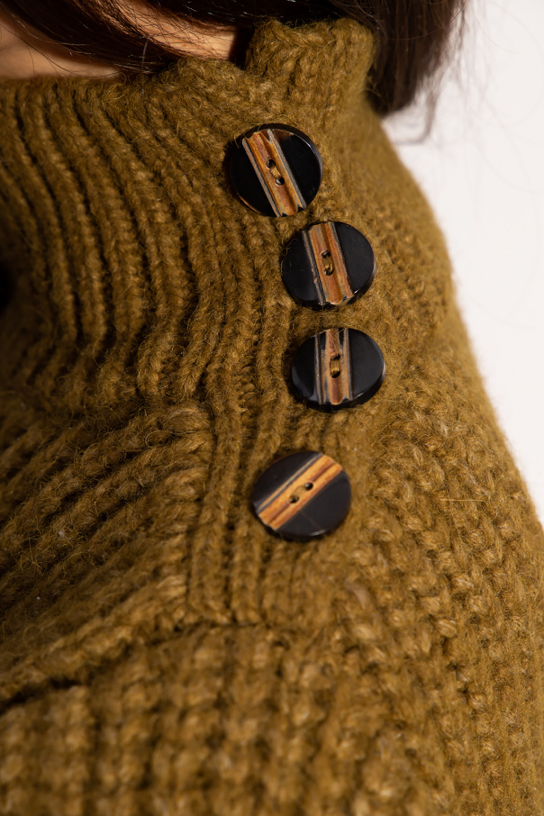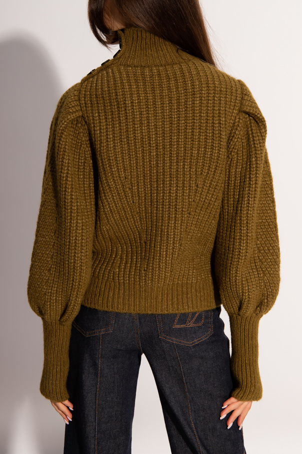 Green and brown ‘Alana’ knitted turtleneck sweater from Ulla Johnson. This garment features buttons at the shoulder and long puff sleeves with thumb holes.