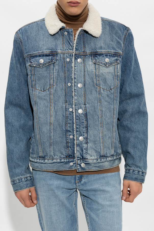 Blue ‘Midland’ denim jacket from AllSaints. Made partially from recycled materials, this garment fastens with buttons and is complete with a white faux fur collar, two slip pockets, two buttoned flap pockets, long sleeves and distressed vintage effect details.