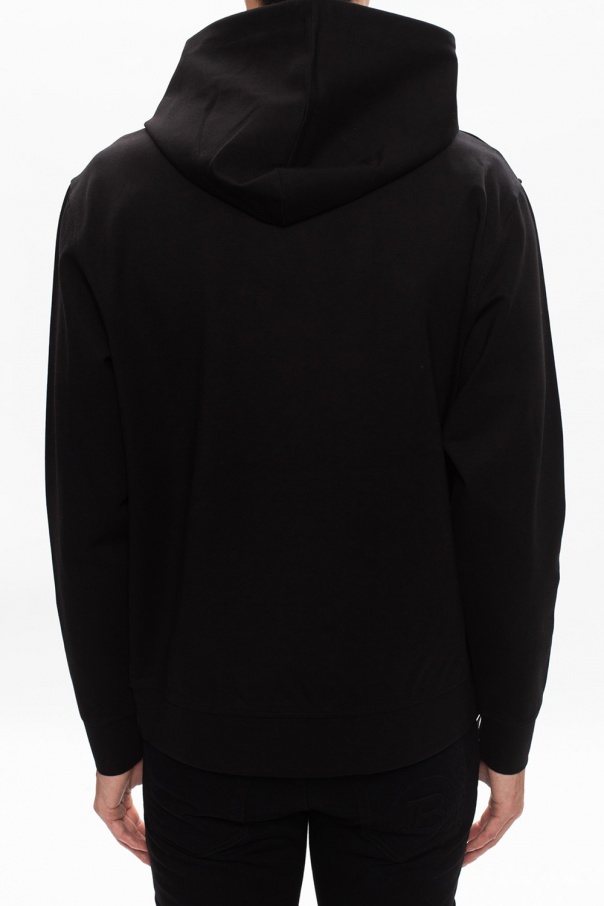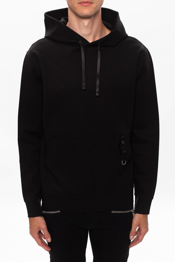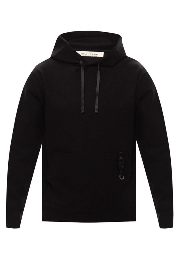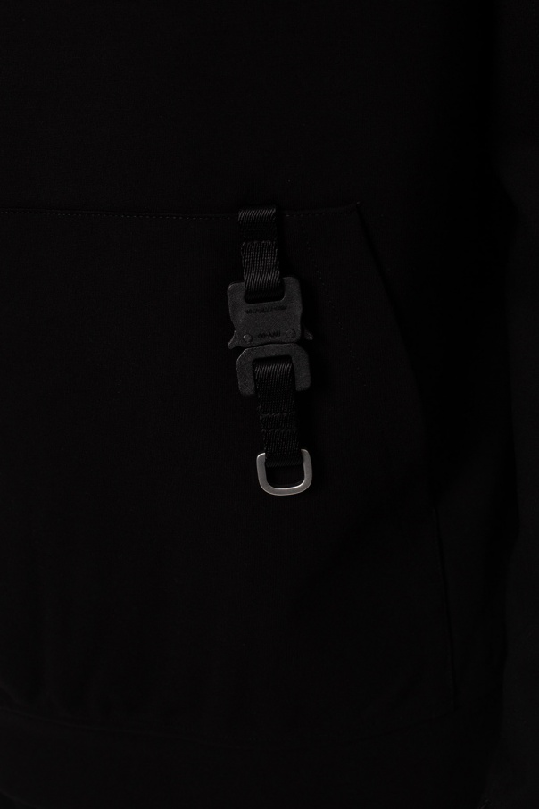 Black sweatshirt with a drawstring hood from 1017 ALYX 9SM. Featuring a strap with a black rollercoaster buckle closure that\'s highly recognisable for the brand, this piece is complete with a kangaroo pocket and rib trims.