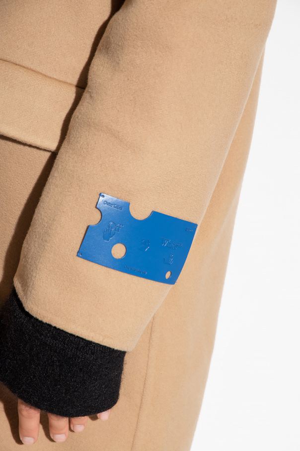 Beige coat from Off-White. Crafted from cashmere, this style features button fastenings, a drawcord-adjustable hood, two flapped pockets, a single back vent and long sleeves – one has a blue logo patch.