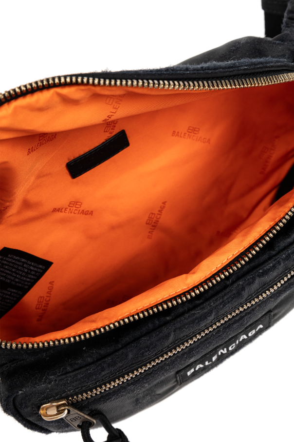 Introducing the Explorer Belt Bag by the illustrious Balenciaga, a paragon of luxury and functionality seamlessly blended into a single accessory. This exclusive piece boasts an oval silhouette crafted with a lush, velvety material, rendering a tactile experience as sophisticated as its aesthetic. The black hue of the bag is accentuated by a striking gold zipper on the front, marrying elegance with ease of access to the main compartment. The distinctive \"BALENCIAGA\" inscription prominently adorns the front panel, signaling the distinguished origin from the haute couture designer. An unexpected twist lies within—the interior reveals a vibrant orange lining, creating a visual intrigue while housing a branded label, affirming its authenticity and premium lineage. Enhancing its practicality, the bag features two external zippered pockets, offering convenient storage for essentials. Coupled with an adjustable strap, this piece affords versatility in wear, allowing for custom fit around the waist or over the shoulder. Made primarily from a sophisticated blend of polyamide and polyester, the Explorer Belt Bag stands as a testament to Balenciaga\'s commitment to quality and innovative design, making it an indispensable addition to the discerning collector\'s repertoire. Why invest in this product? Luxurious, velvety material with gold zipper detail exudes elegance. Iconic branding and vibrant interior lining offer a unique aesthetic appeal. Functional design with multiple pockets and adjustable strap enhances versatility. Exclusivity guaranteed by the renowned high-fashion house of Balenciaga.