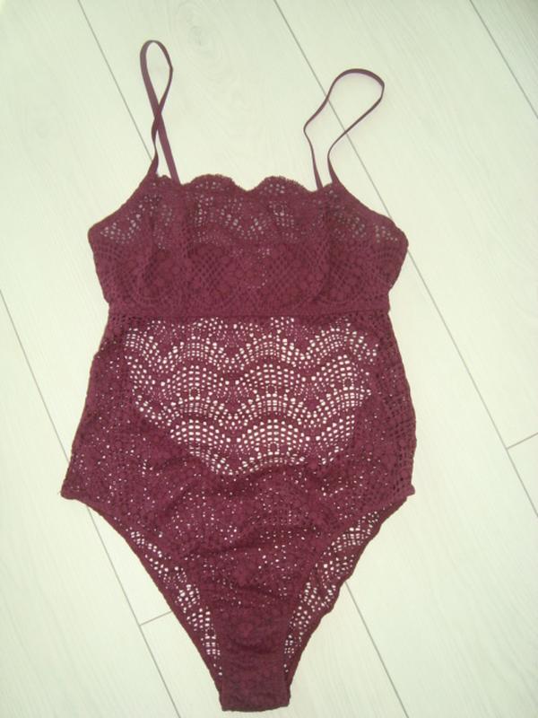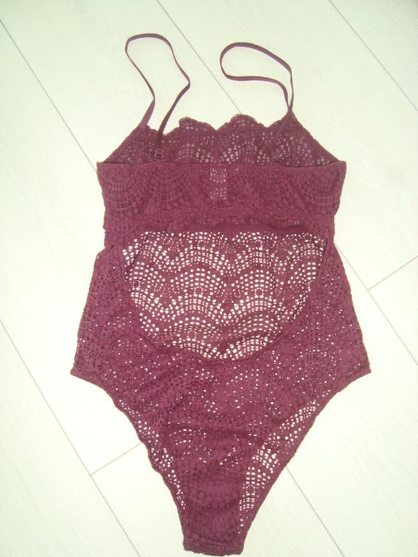 Чарівне боді від Victoria's secret, розмір по бірці S. Боді в кольорі бургунді повністю виконане з крупного мережива, область грудей на тюльовій підкладці, відкрита спинка, цільнокроєне боді, без застібок. Тонкі верхні ремені із регулюванням. Довжина боді (без урахування ременів)-53,5см,ПО під грудьми-28см, ПОТ-31см, ПОБ-36см, пройма ноги-25см. Стан боді ідеальний