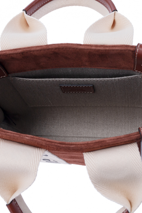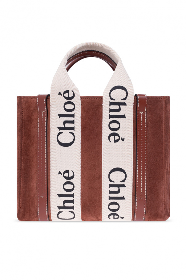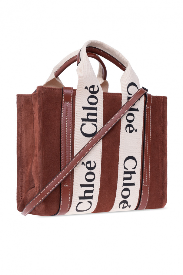 Brown and cream ‘Woody Small’ shopper bag from Chloé. Crafted from calf suede and trimmed with smooth leather and fabric, this design showcases a printed black logo, two half-round handles, a detachable and adjustable shoulder strap, gold-tone metal hardware and a linen-clad interior with one compartment and one slip pocket.
