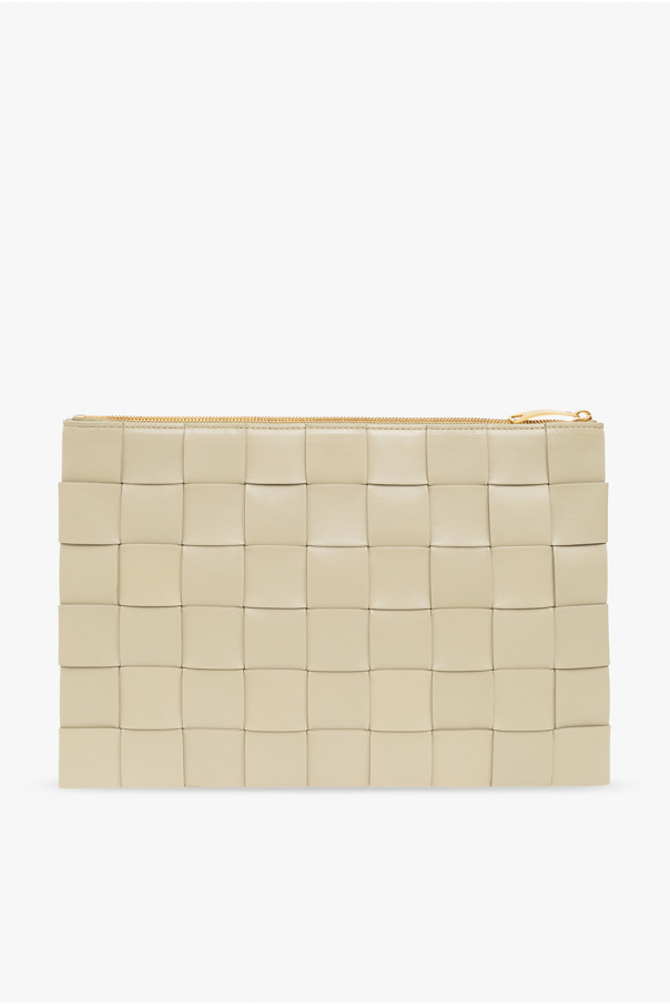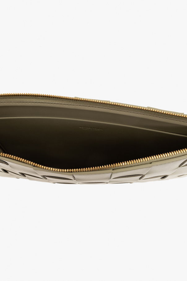 Greenish grey ‘Pouch Large’ clutch from Bottega Veneta. Crafted from a blend of calf leather and lamb leather, this design showcases the brand\'s signature Intreccio weave. It is complete with a zip fastening, gold-tone metal hardware and one internal compartment with a slip pocket.