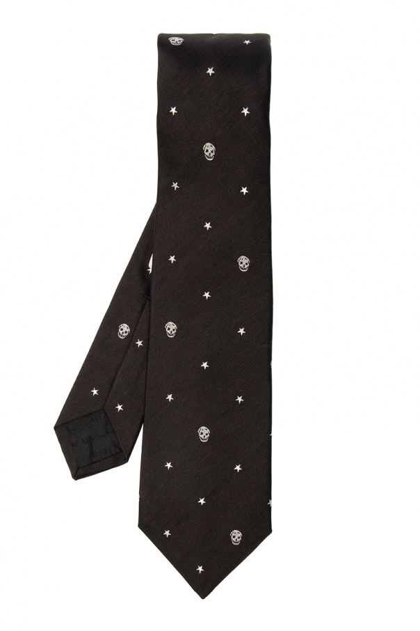 Black tie from Alexander McQueen. Made of silk, this item was woven with the designer\'s signature motifs of skull and stars.