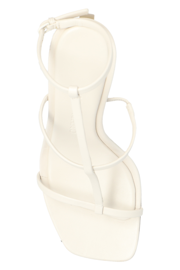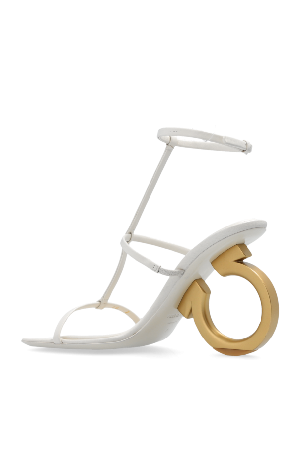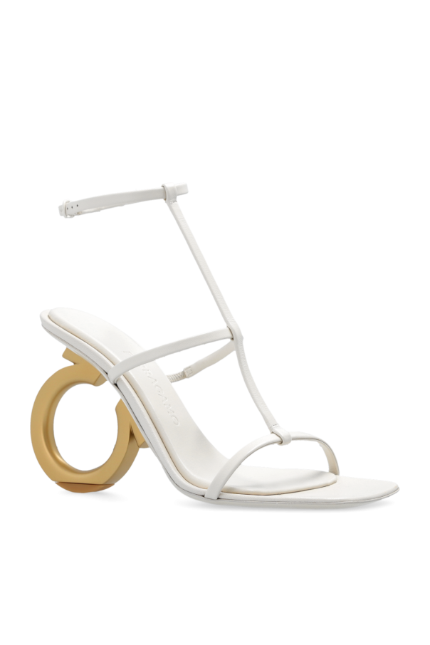 Cream ‘Elina’ heeled sandals from FERRAGAMO. Made of leather, this model sits on a cream leather sole and features an ankle strap and a decorative heel. Standard footbed.