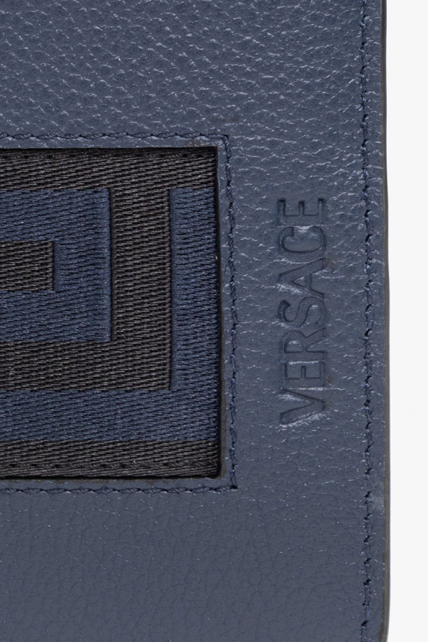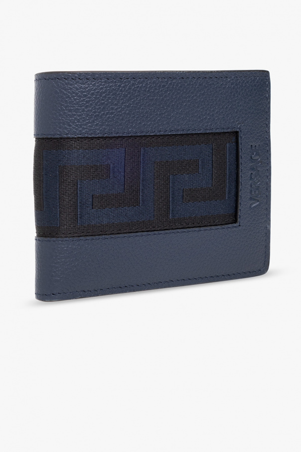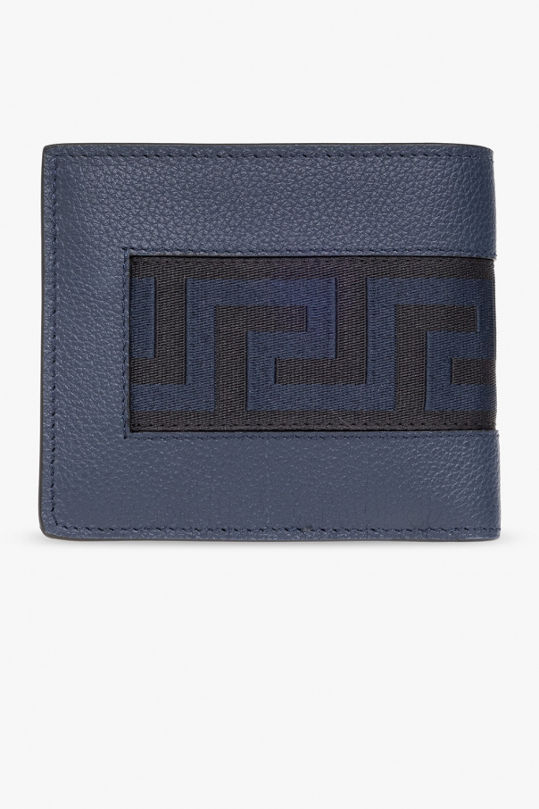Navy blue bi-fold wallet from Versace. Made from calf leather, this design features an embossed logo, a black Greca insert and two bill compartments, two slip pockets, one snap-fastened coin pocket and three card slots inside.