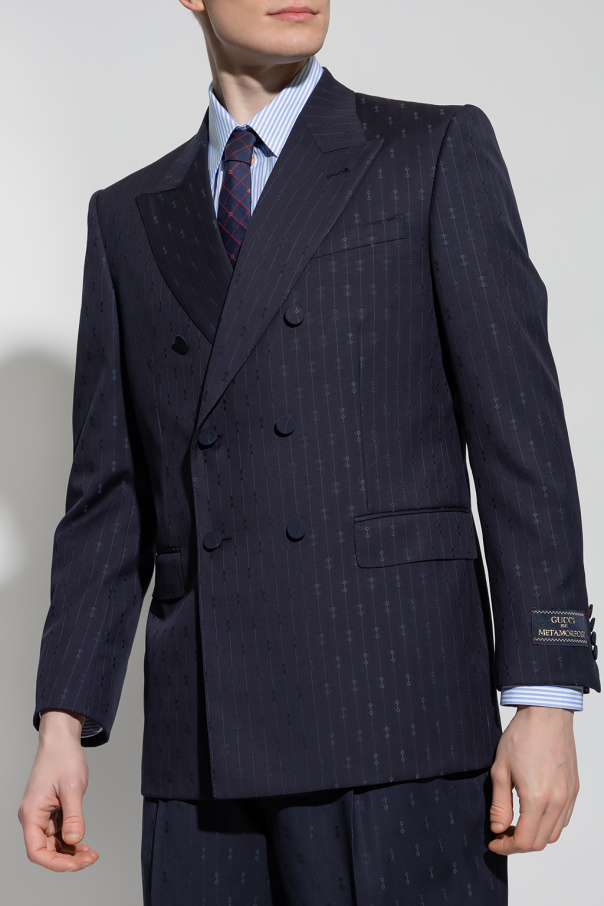 Navy blazer from Gucci. Crafted from wool, this design features button fastenings, horsebit pattern, peak lapels, two flap pockets, one slip pocket, sleeve patch with a logo and single rear vent.