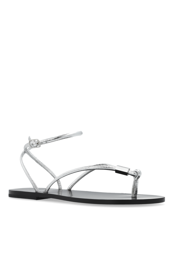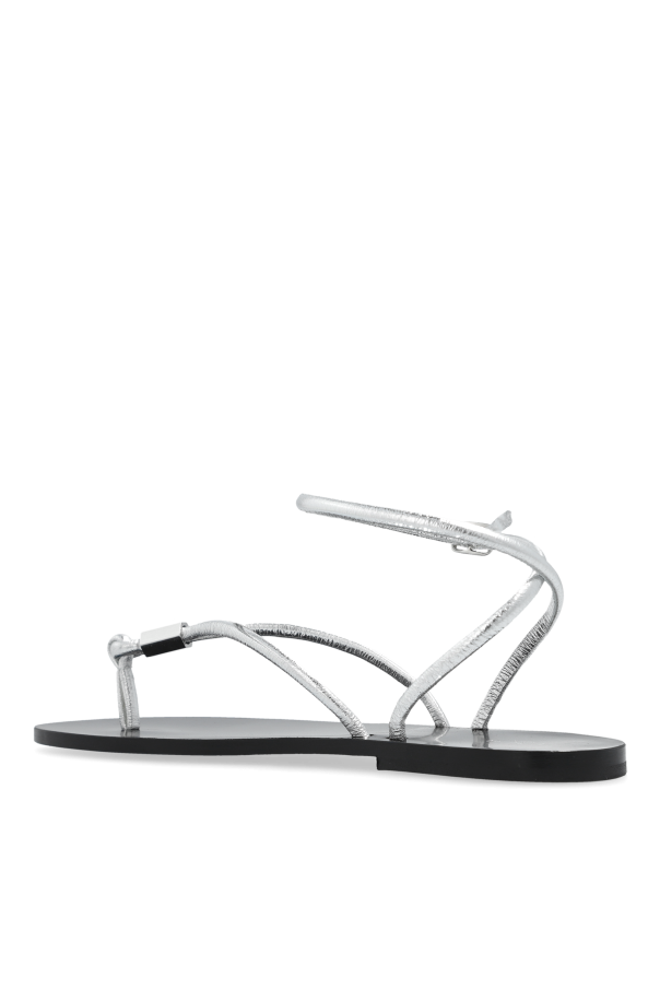 Introducing the ‘Aventurine’ Sandals by Iro, a symphony of elegance and comfort encapsulated in a minimalist design. Crafted with meticulous attention to detail, these sandals are an epitome of refined luxury. The dominant silver hue, both universal and sophisticated, makes these sandals a versatile choice, effortlessly complementing an array of ensembles. The ‘Aventurine’ features slender straps that gracefully wrap around the toe and ankle, secured by an adjustable strap with a buckle at the rear, ensuring a perfect fit. The shimmering material of the straps, possibly metallic or light-reflective, enhances their sophisticated allure. A flat, black leather sole ensures lasting comfort, allowing for prolonged wear without sacrificing style. Unique to this design is a subtle metal applique at the front, etched with the designer\'s logo, adding a discreet yet distinctive mark of luxury. The absence of overt branding ensures the sandals\' elegance and sophistication take center stage, making them an ideal choice for those who appreciate understated luxury. Why Purchase the ‘Aventurine’ Sandals? Exquisite Craftsmanship: Luxuriously constructed with a leather outer, inner, and sole for supreme comfort and durability. Minimalist Elegance: Sleek design featuring slender, shimmering straps and a metal logo applique, embodying understated sophistication. Versatile Styling: The radiant silver color pairs seamlessly with everything, from casual jeans to elegant evening dresses. Comfortable Fit: Designed with a flat sole and adjustable ankle strap, ensuring comfort without compromising on style.