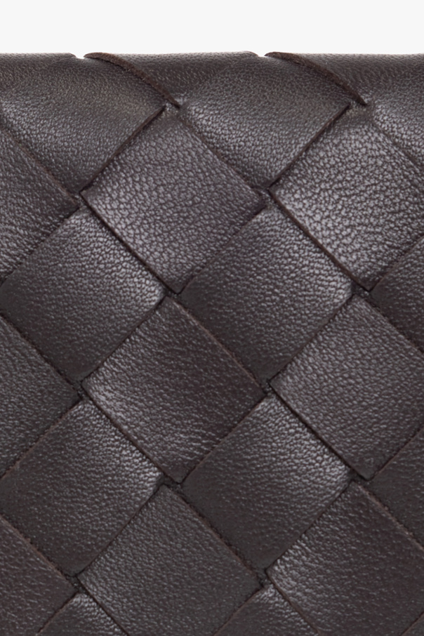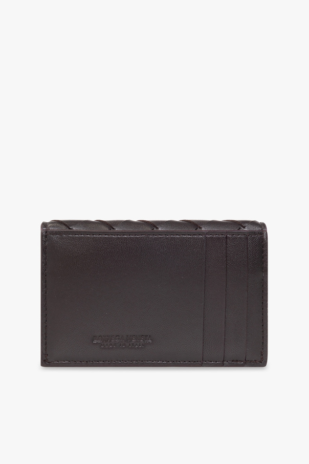 Dark brown card case from Bottega Veneta. Crafted from lamb leather and calf leather with the brand\'s signature ‘Intrecciato’ weave, this design features a a snap fastening, one internal compartment and one slip pocket and three card slots inside.