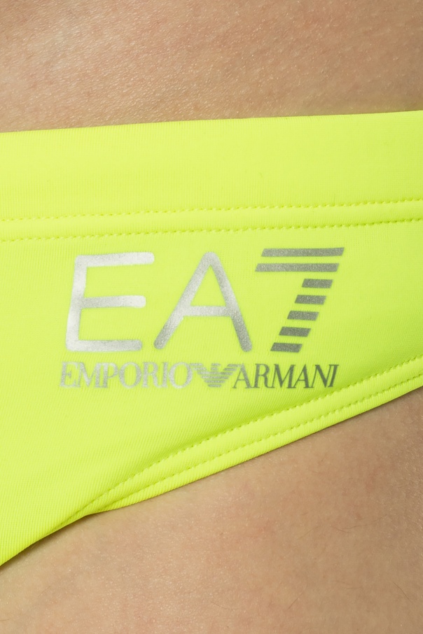 Neon yellow swim briefs from EA7 Emporio Armani. Pulled with drawstrings. Embellished with silver-tone logo print.