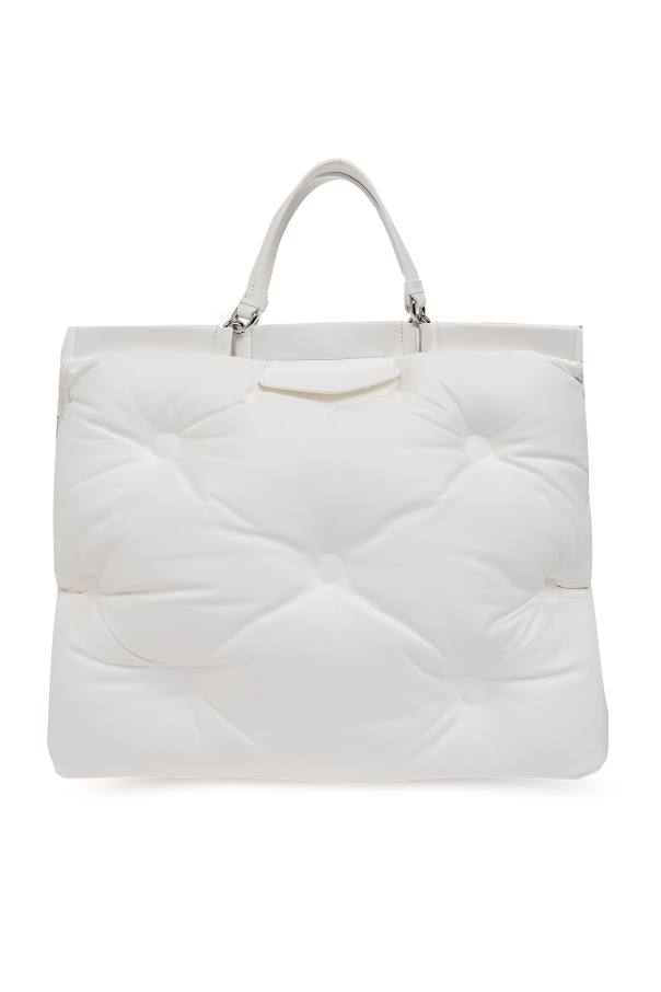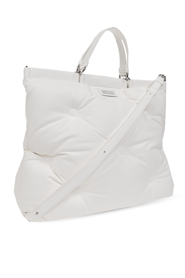 White ‘Glam Slam Shopper Large’ shopper bag from Maison Margiela. Crafted from quilted leather, this design secures with a magnetic fastener and features a signature logo patch on the front. It is complete with a detachable and adjustable shoulder strap, two half-round handles, silver-tone metal hardware and one internal compartment with a zip pocket.