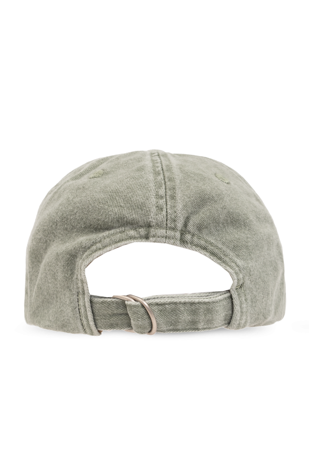 Greenish-grey baseball cap from Acne Studios. Crafted with a washed effect, this item showcases an embroidered yellow logo and an adjustable buckle strap on the back.
