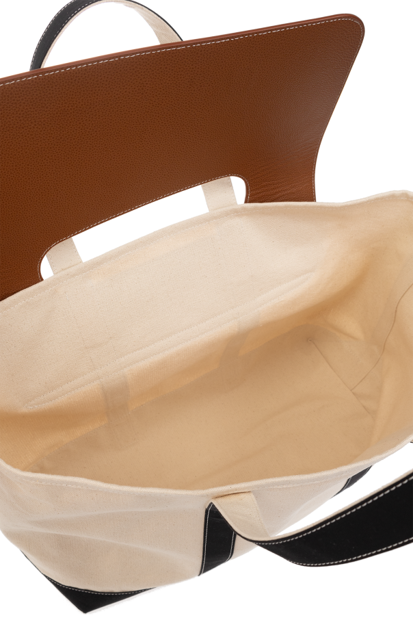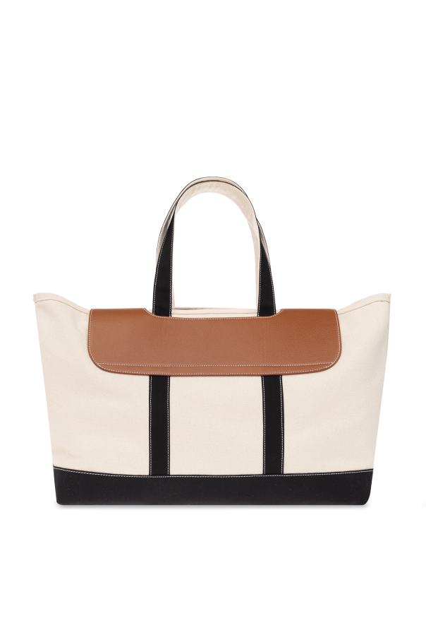 Cream, brown and black travel bag from Palm Angels. Made of leather and fabric, this model features a flap, two half-round handles and one internal compartment.