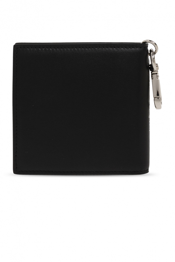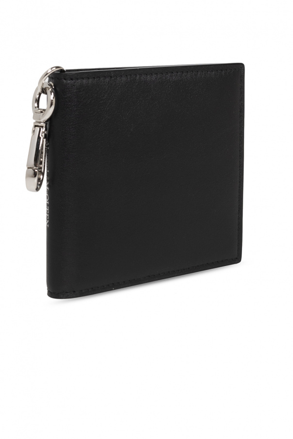 Black bifold card holder from Alexander McQueen. Crafted from calf leather, this model features a magnetic snap, snap hook, silver-tone logo print and eight internal card slots.