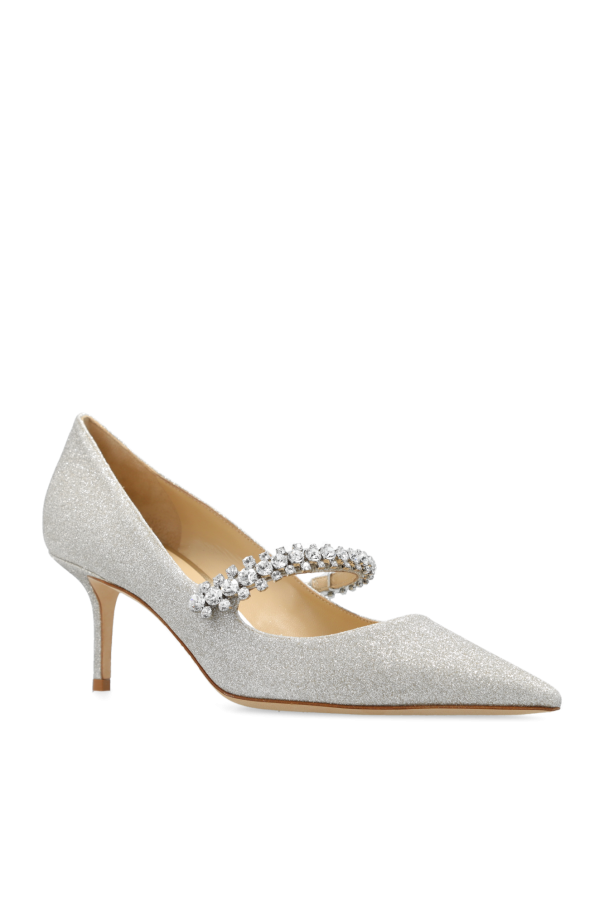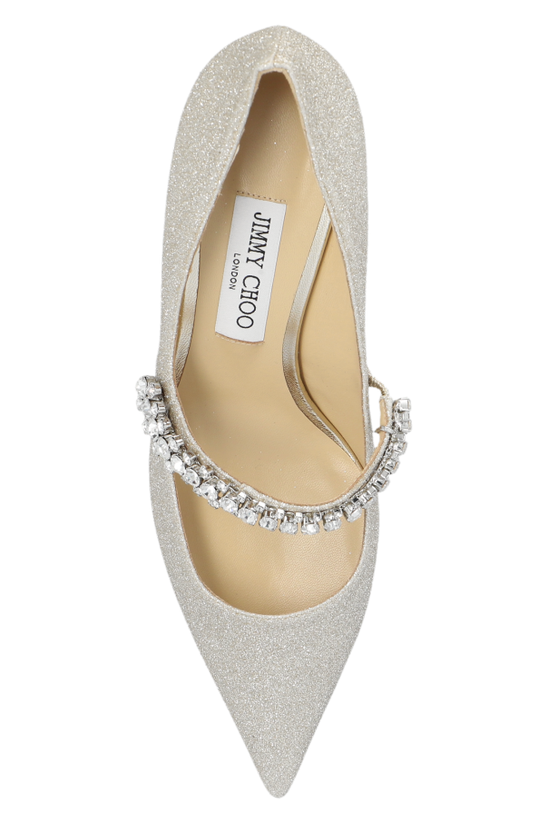 Light gold-tone ‘Bing’ pumps from Jimmy Choo. Made of fabric with a glitter finish, this design features a strap with a crystal detail, pointed toe and beige leather sole.