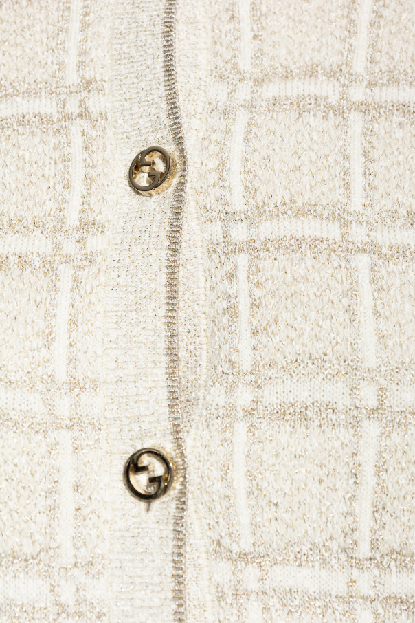 Introducing the Kardigan z lureksową nicią, an exquisite creation from the house of Gucci. In a captivating cream hue with a golden shimmer, this cardigan is meticulously crafted from a blend of premium materials, including luxurious wool and shimmering metallic threads. The elegant plaid pattern adds both texture and sophistication, making it an ideal choice for the discerning fashion connoisseur. The cardigan boasts a timeless silhouette with long sleeves and a round neckline, offering a perfect fit that accentuates the figure. Exquisite attention to detail is evident in the expertly finished hems and the striking metal buttons adorned with the designer\'s logo, emphasizing its opulent appeal. Additionally, it features two functional pockets, seamlessly merging practicality with style. Why Choose This Product? Luxurious blend of materials with a subtle, sophisticated shimmer Classic design enhanced by a distinctive plaid pattern Signature metal buttons with designer logo for added elegance Functional and stylish with two pockets