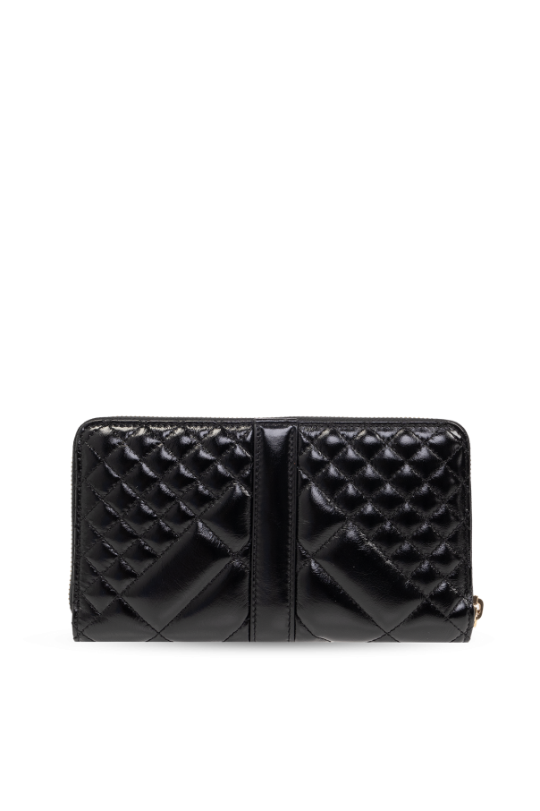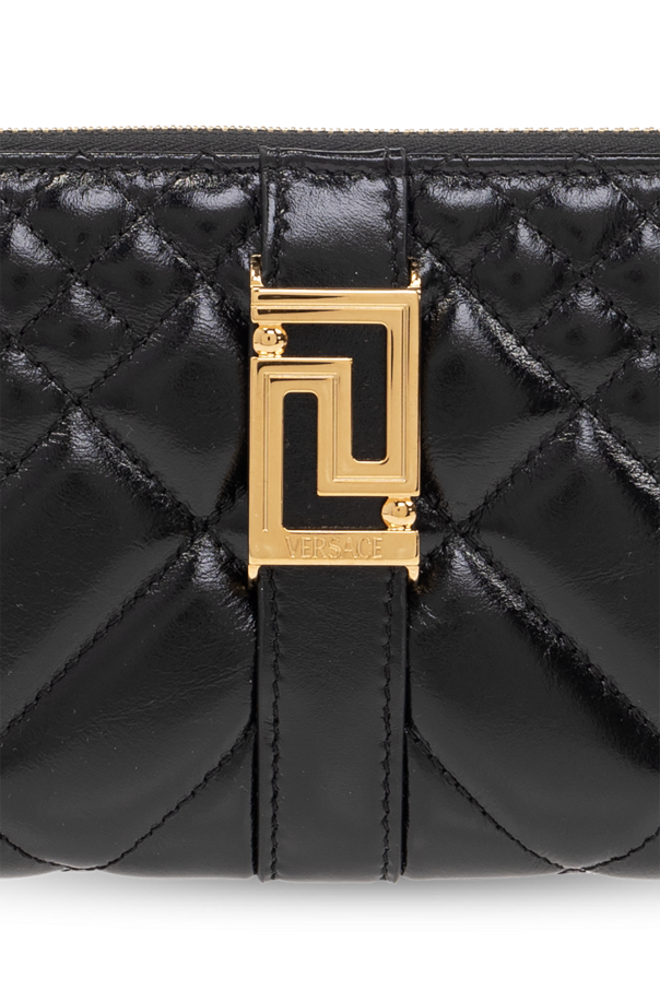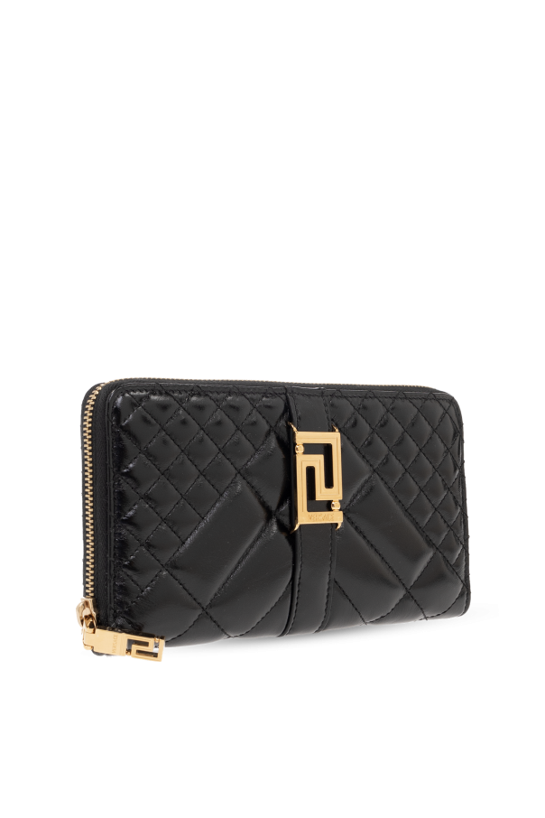 Introducing the epitome of sophistication and functionality: the Versace Quilted Leather Wallet. This exquisite piece, meticulously crafted from 100% calf leather, showcases the unparalleled craftsmanship and luxurious design synonymous with the esteemed Versace brand. The wallet\'s exterior is adorned with a distinctive quilted pattern, featuring diamond shapes that lend an air of refinement and texture, echoing the opulent motifs found in high-end leather goods. The wallet\'s practical elegance is further enhanced by its gold-tone zip closure, which gracefully encircles the majority of the item, allowing for seamless access to its contents. A focal point of its design is the gold-tone metal designer logo placed on the front flap, serving not just as an ornament but as a testament to its exclusive lineage and designer pedigree. The interior reveals a thoughtfully designed space with multiple compartments for cards and documents, alongside a separate zippered section for coins, all lined with a high-quality fabric that contrasts beautifully with the outer leather. This Versace black quilted wallet is not just a statement of style but a testament to the marriage of luxury and practicality. Why Choose This Product? Exclusively crafted from premium calf leather for durability and elegance. Iconic quilted design with diamond motifs, adding texture and sophistication. Featuring Versace\'s signature Greca motif metal application, elevating its luxury appeal. Functional interior with three compartments, three slip pockets, a zippered coin pocket, and twelve card slots, ensuring ample space and organization. Embellished with gold-tone hardware for a touch of glamour.