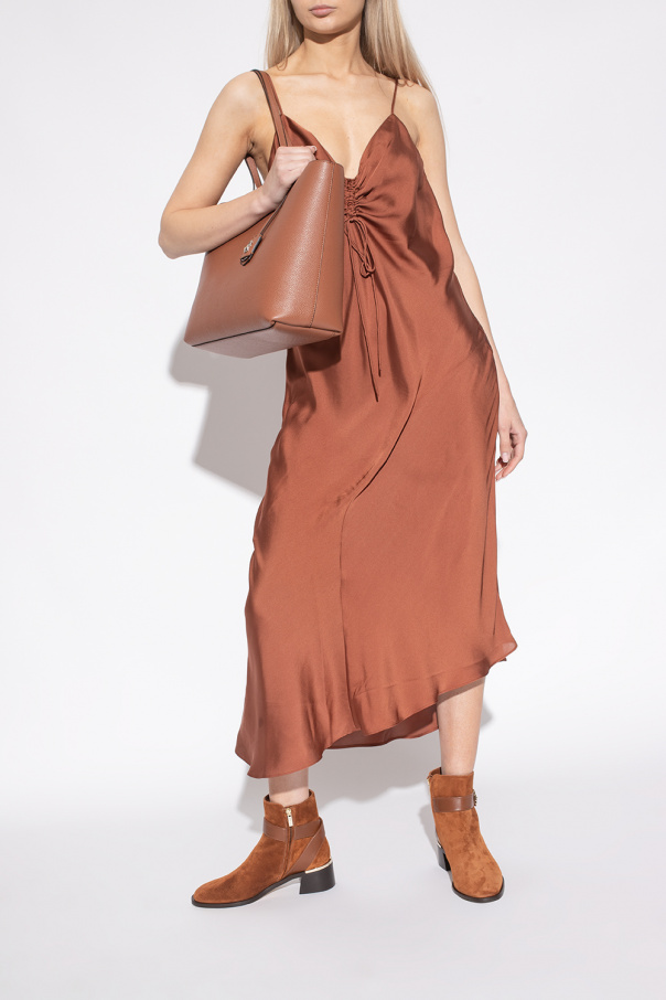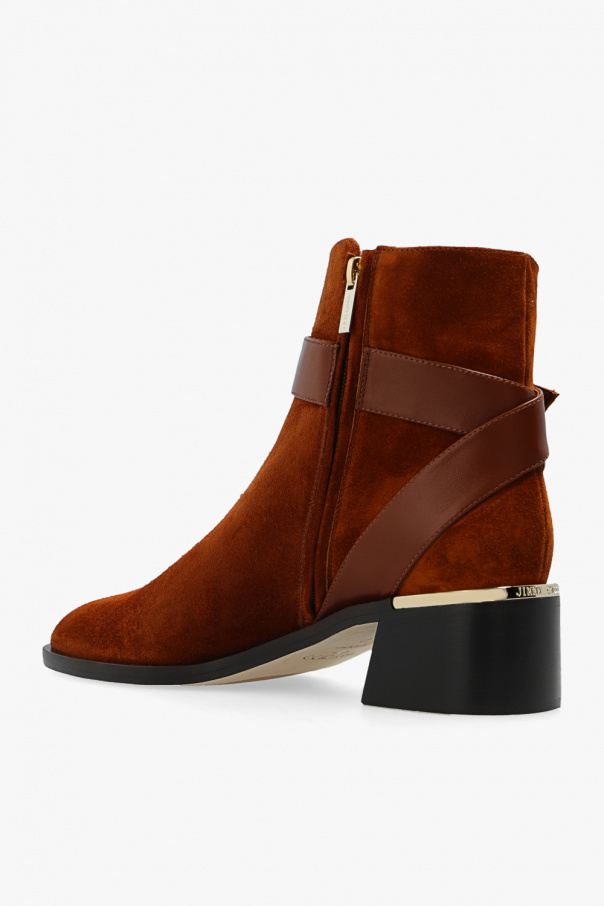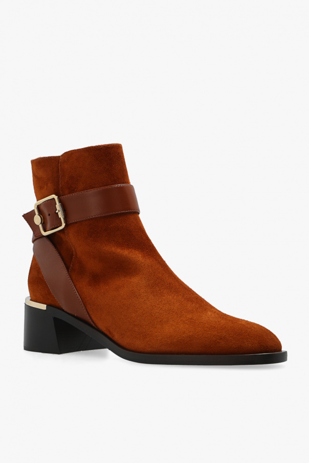Brown ‘Clarice’ ankle boots from Jimmy Choo. Crafted from suede and smooth leather, this model sits on a beige and black sole in leather and rubber and features a logo plaque on the heel and a zip fastening and strap with a gold-tone buckle with an embossed logo on the side.