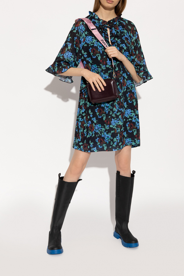 Black rain boots from Ganni. Crafted from recycled rubber, this model features two grosgrain tapes, a logo print and a blue rubber sole.