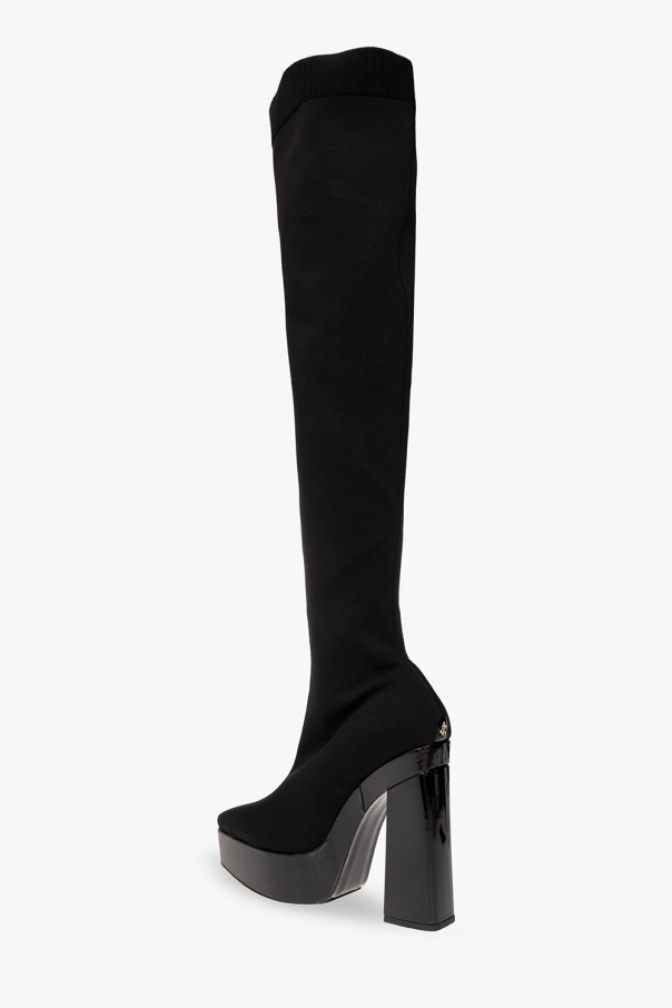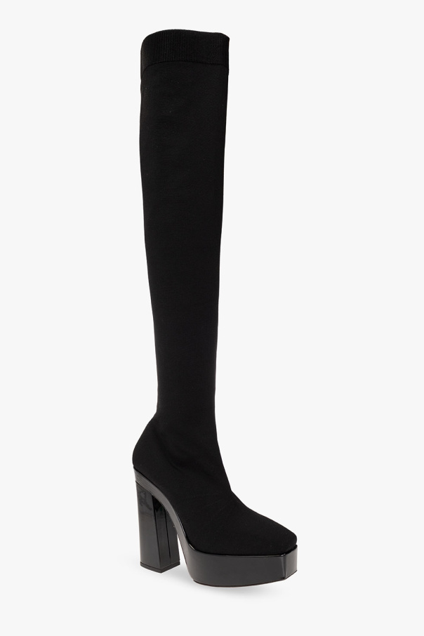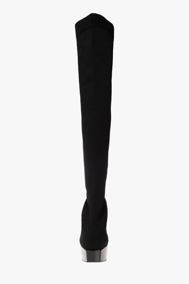 Black ‘Giome’ over-the-knee boots on a platform from Jimmy Choo. Crafted from fabric, this model features an elastic hem, a tapered toe, a glossy platform and heel and a light beige leather sole.
