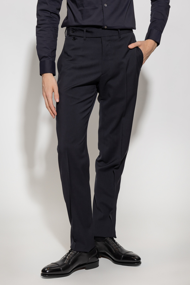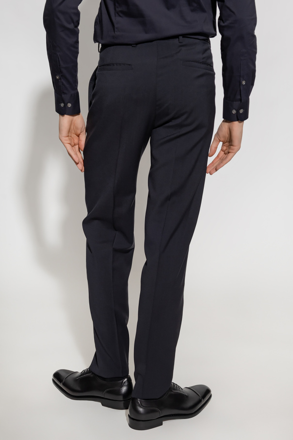 Navy pleat-front trousers from Emporio Armani. Made of virgin wool, this tapered leg pair features a zip, hook and button fastening and four slip pockets.