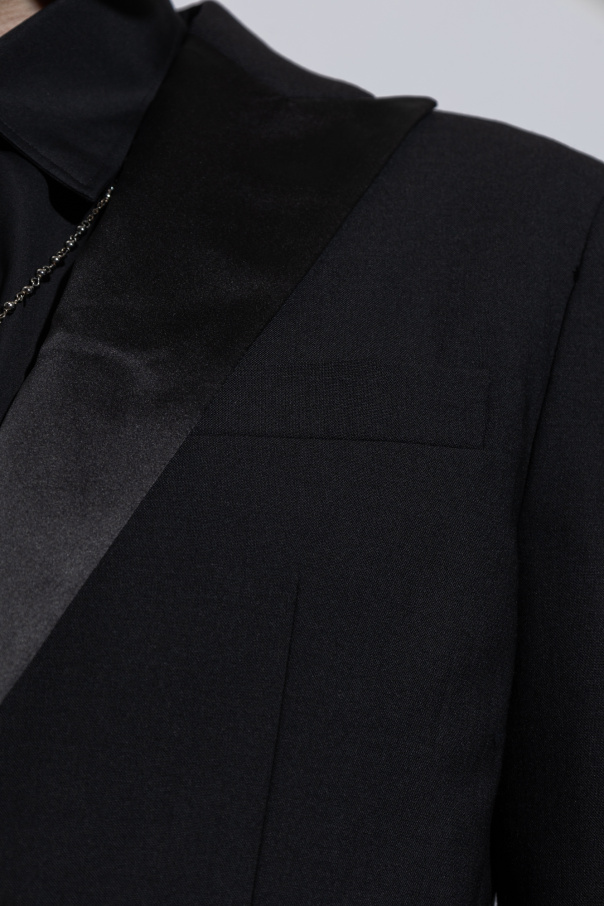 Black suit with a satin trim from Dsquared2. This ensemble includes a double-vented blazer with button closures, one welt pocket, two flapped pockets and long sleeves and trousers featuring a zip fly with a button and hook, two side seam pockets, two back button pockets and slightly tapered legs with pleats.