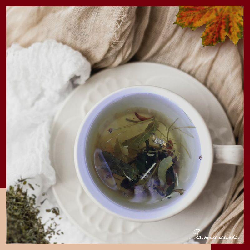 В состав чая входят листочки крапивы, мелиссы, пастушьей сумки, дикой ежевики, липы и шишки хмеля.