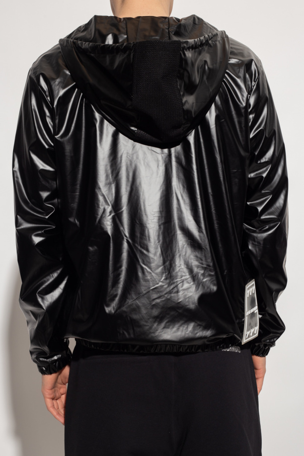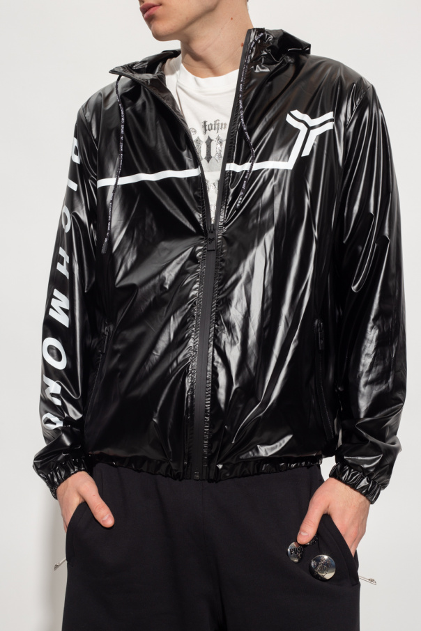 Black jacket with a drawcord-adjustable hood from John Richmond. Enriched by a white graphic print with the brand\'s logo, this style features a zip fastening, two zip pockets and an elasticated bottom hem and cuffs.