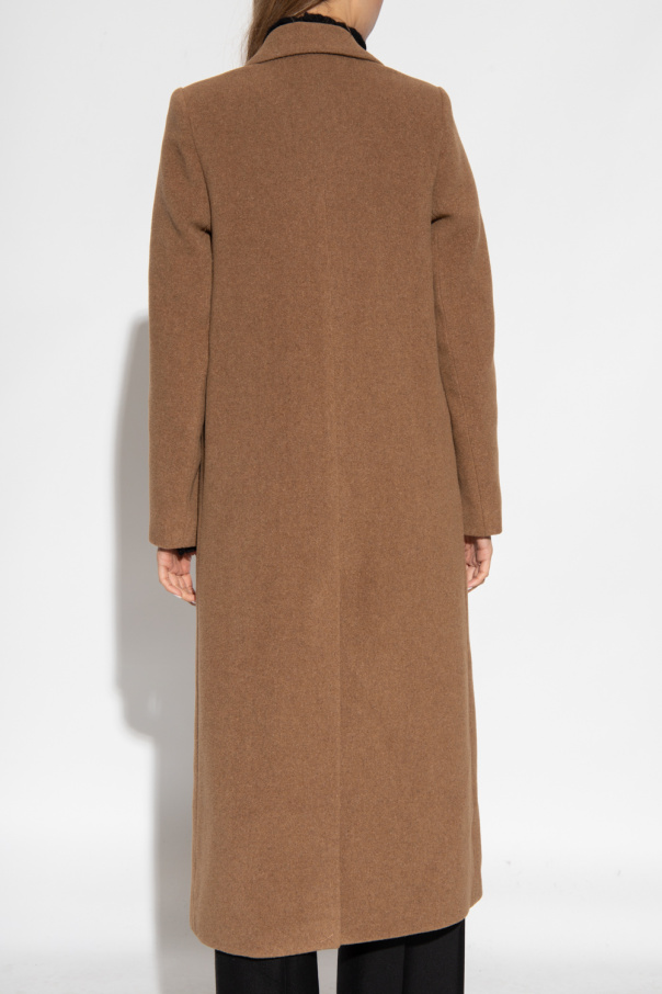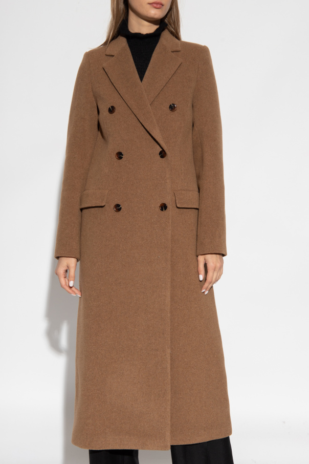 Brown ‘Falcon’ double-breasted coat from Samsoe Samsoe. Crafted from wool, this style features button fastenings, notch lapels, two flapped pockets, long sleeves and a single back vent.