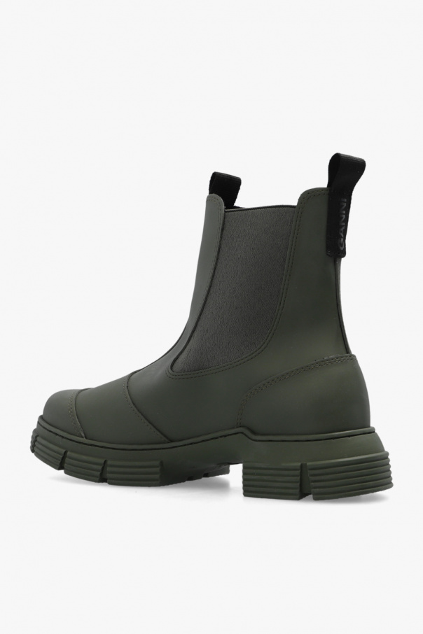 Khaki short rain boots from Ganni. This pair features decorative stitching, grosgrain pull tab with a logo and black rubber sole.